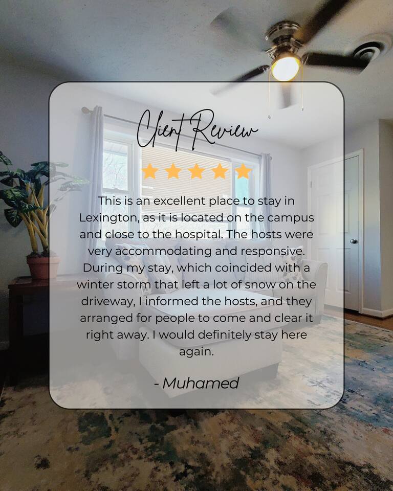 We want all of our guests to have the best possible experience during their stay. Quiet Hours are from 11:00 PM to 7:00 AM. Be respectful of your neighbors by not playing loud music or sound during these hours. We also ask that you keep the volume at a respectful level during day hours as we do have guests who work third shift schedules occasionally. We look forward to hosting you during your stay in Lexington! STR Registration#:10960200-3 Only guests listed on the reservation can stay overnight. Please inform us if you will have any other visitors to the apartment. Maximum Occupancy Limit: 8