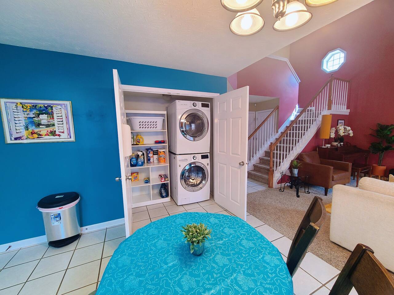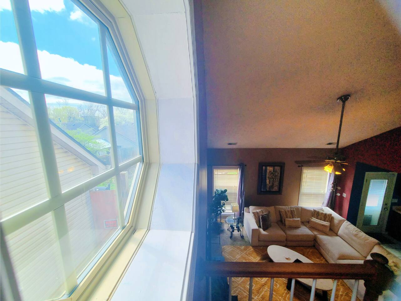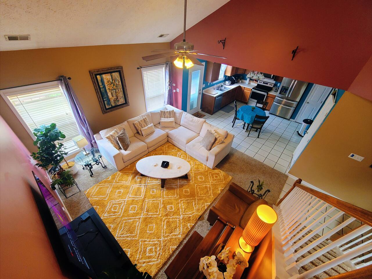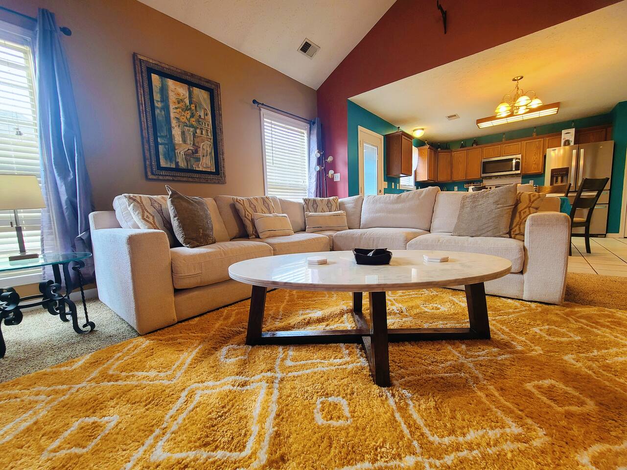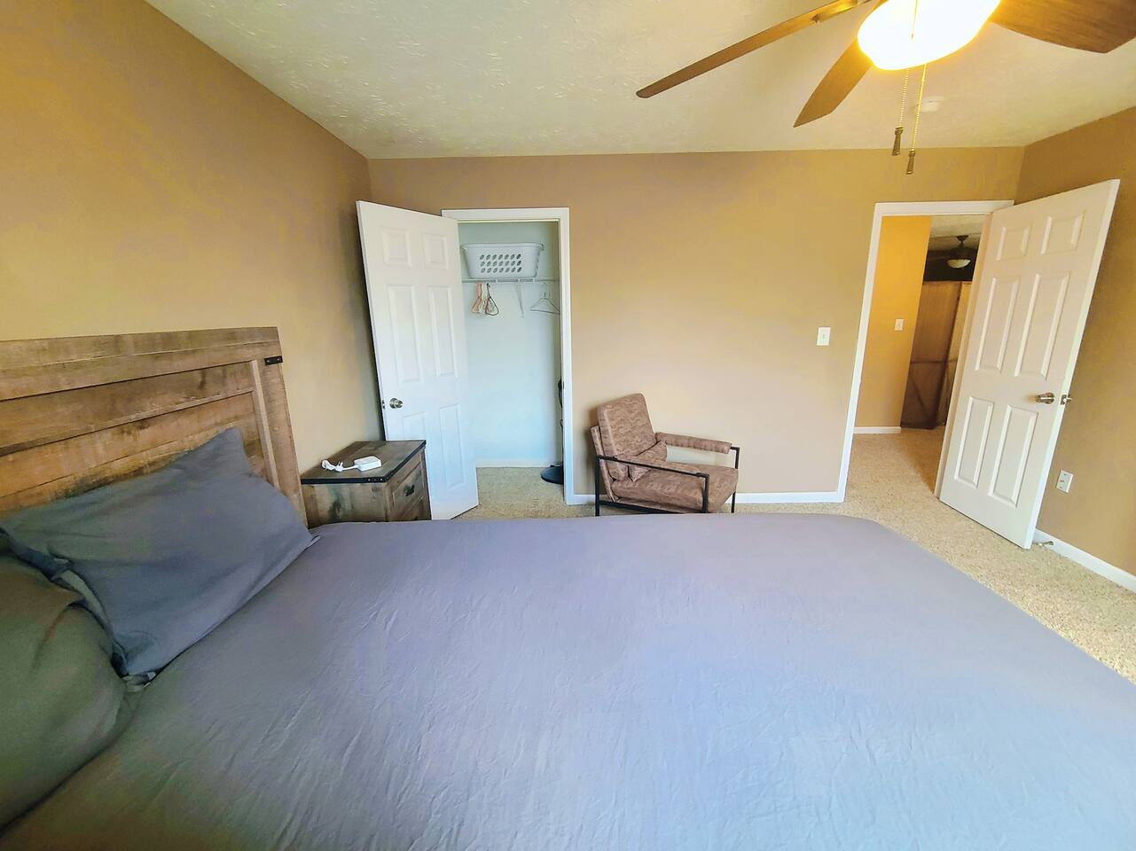 🛋 Living & Common Areas Enjoy a spacious living room with plenty of room to relax, entertain, or gather as a group. The full kitchen is fully equipped with appliances, cookware, and dining essentials—perfect for home-cooked meals. A washer and dryer are conveniently located in-unit for your laundry needs. 🛏 Bedrooms & Layout 4 beds total: 1 King (downstairs), 3 Queens (upstairs) Downstairs: King bedroom with private en-suite + shared half bath Upstairs: 2 private Queen bedrooms with doors 1 open Queen room with walk-in closet, workstation, and sofa bed 1 shared full bathroom upstairs 🌿 Outdoor Space The home features outdoor areas where you can enjoy fresh air, relax with your morning coffee, or unwind in the evenings.