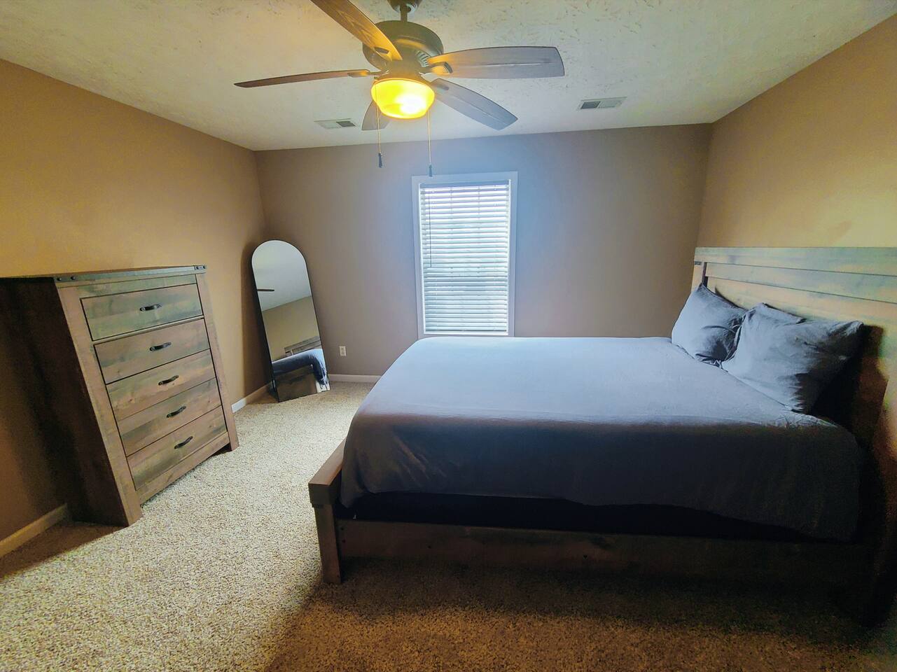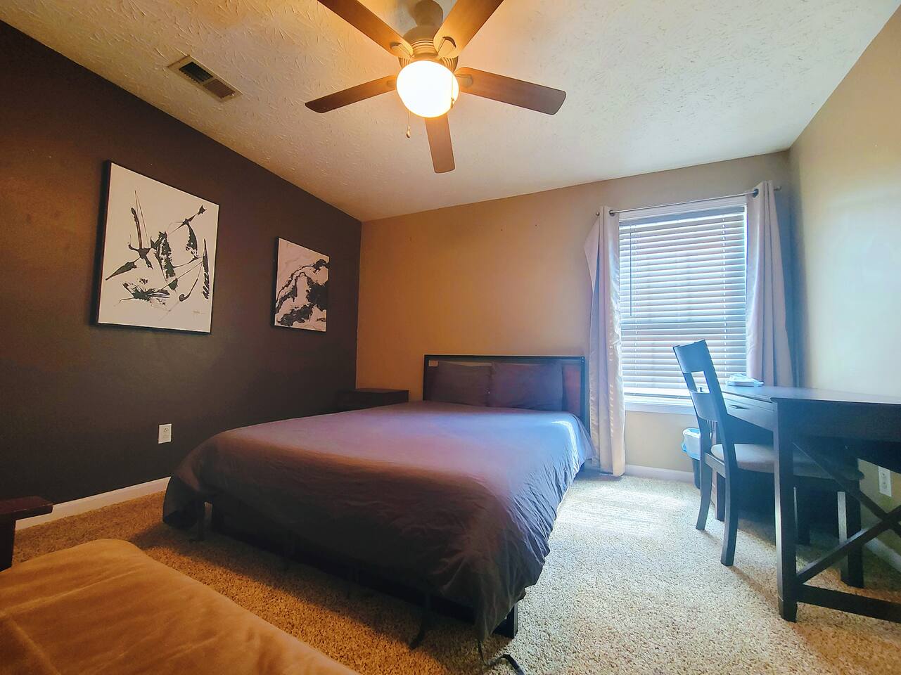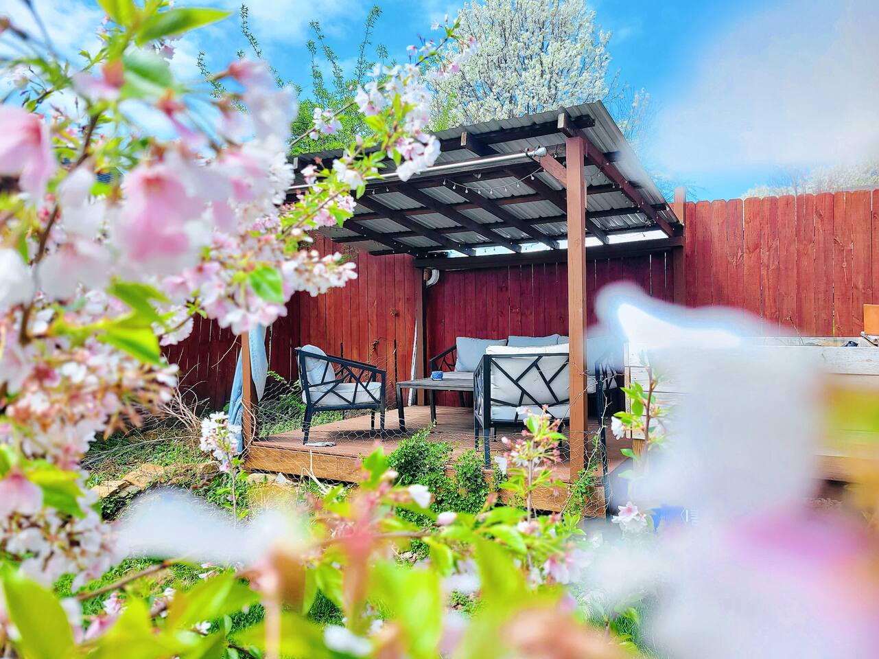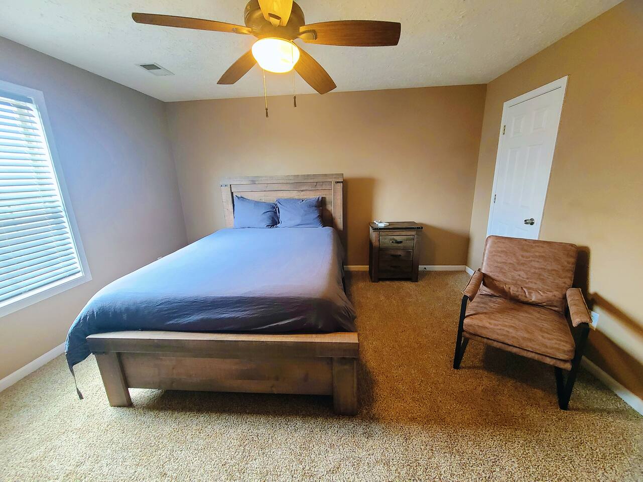🛋 Living & Common Areas Enjoy a spacious living room with plenty of room to relax, entertain, or gather as a group. The full kitchen is fully equipped with appliances, cookware, and dining essentials—perfect for home-cooked meals. A washer and dryer are conveniently located in-unit for your laundry needs. 🛏 Bedrooms & Layout 4 beds total: 1 King (downstairs), 3 Queens (upstairs) Downstairs: King bedroom with private en-suite + shared half bath Upstairs: 2 private Queen bedrooms with doors 1 open Queen room with walk-in closet, workstation, and sofa bed 1 shared full bathroom upstairs 🌿 Outdoor Space The home features outdoor areas where you can enjoy fresh air, relax with your morning coffee, or unwind in the evenings.