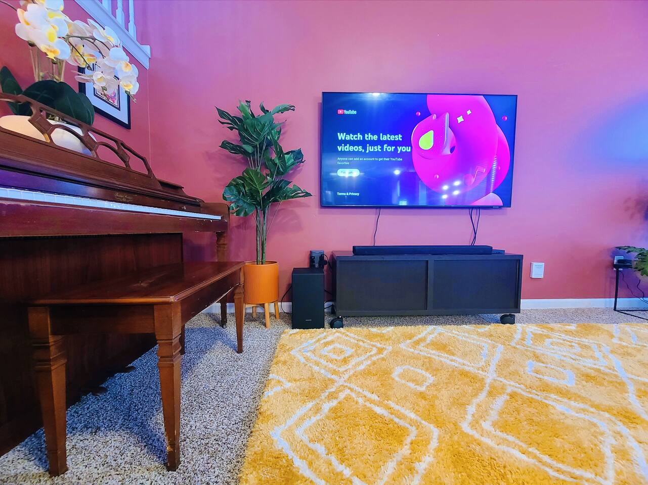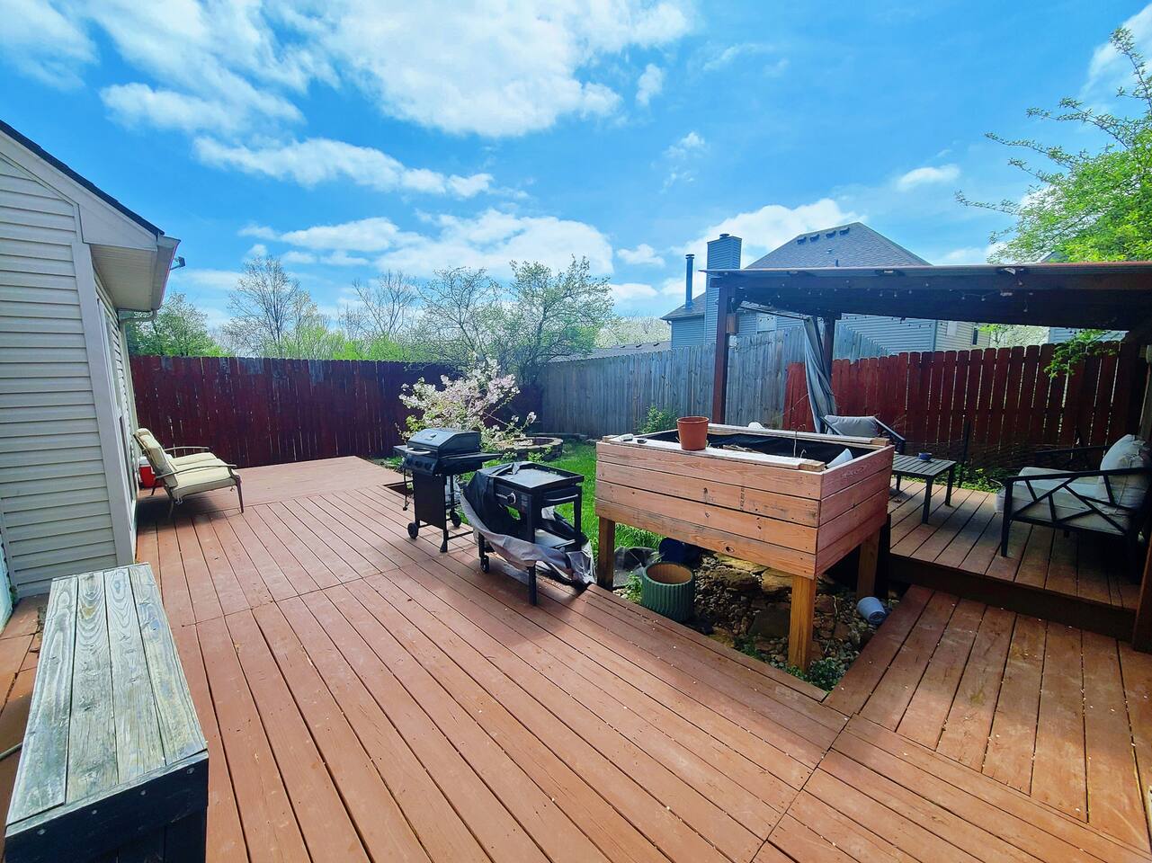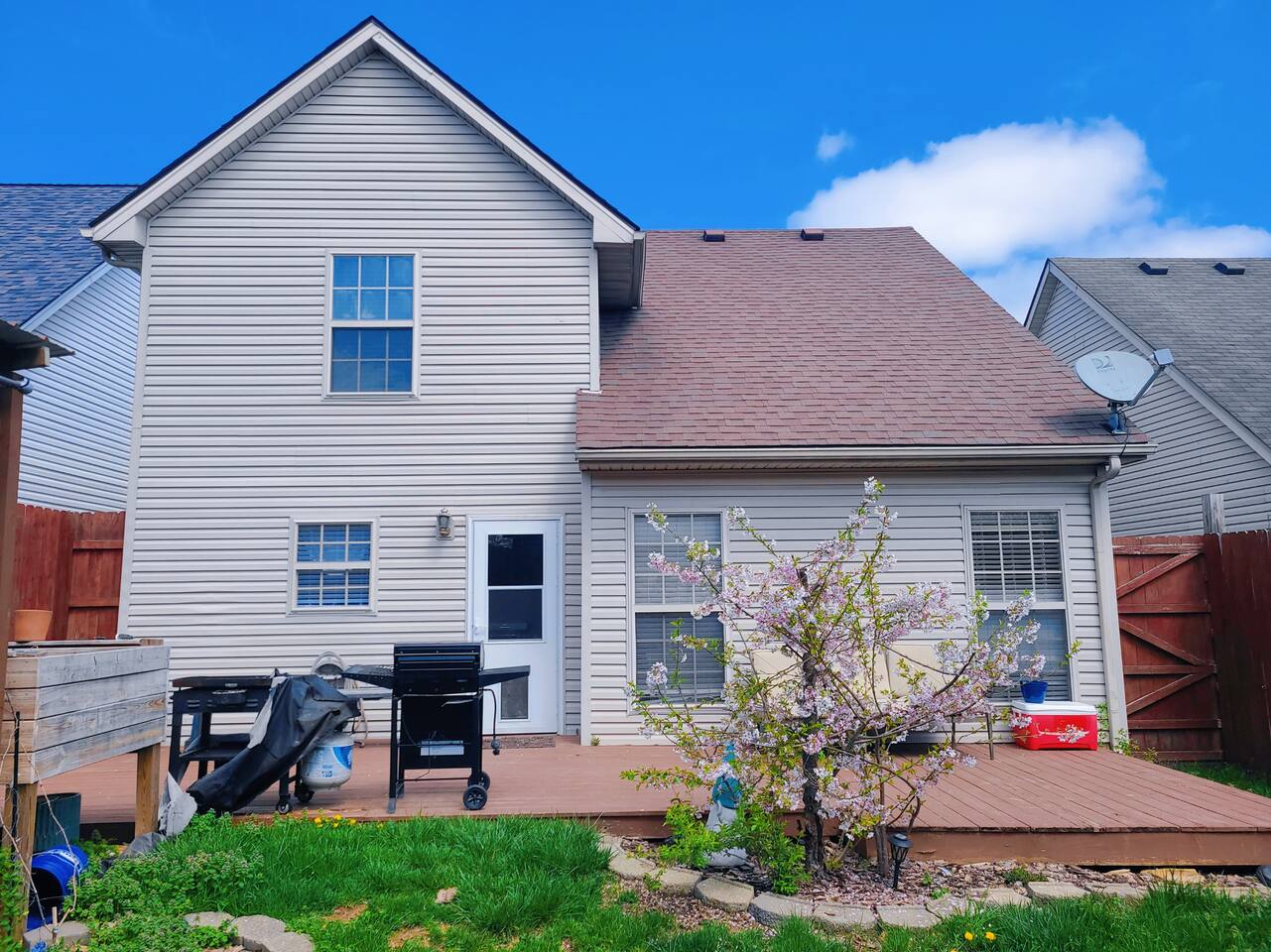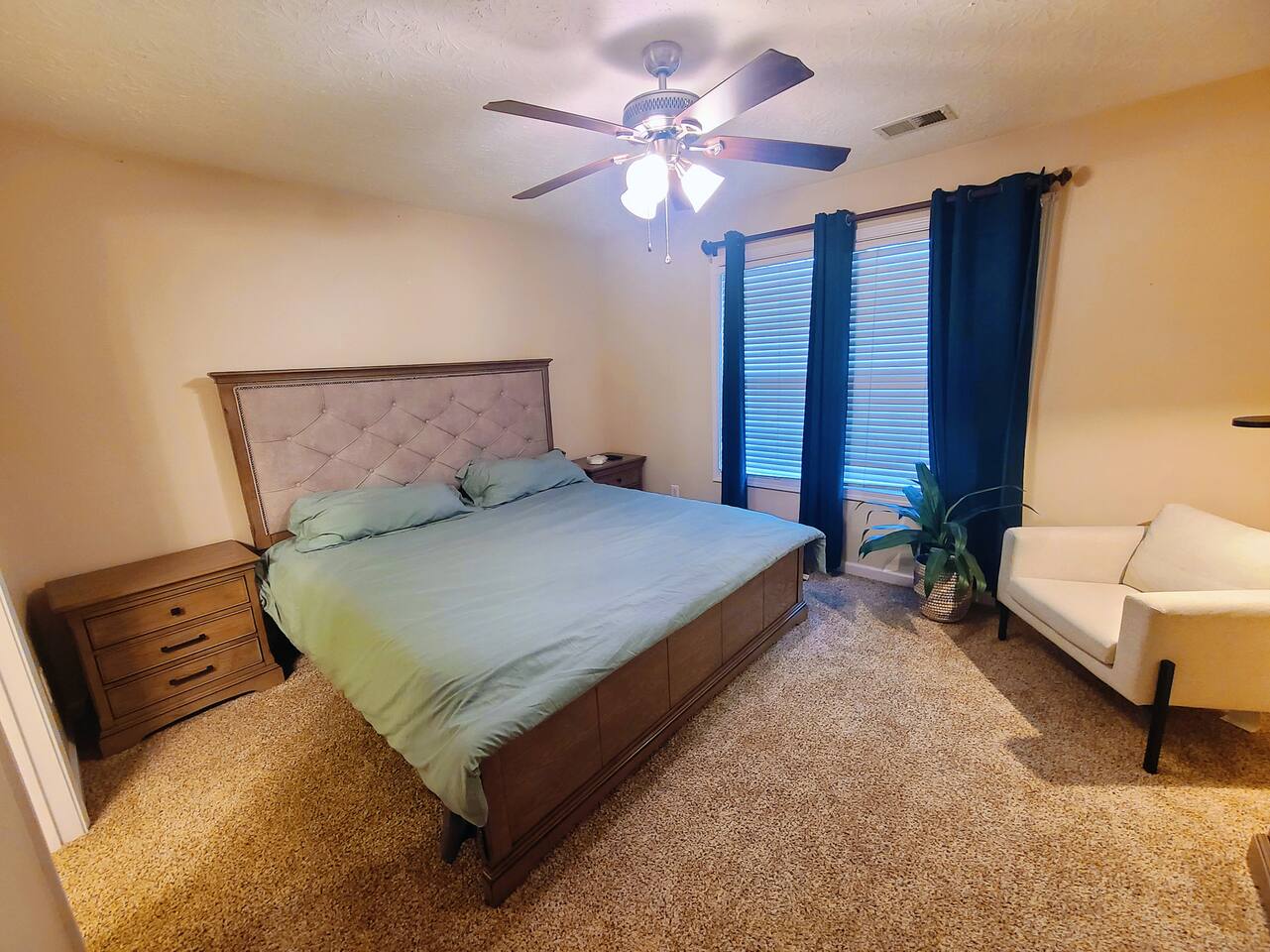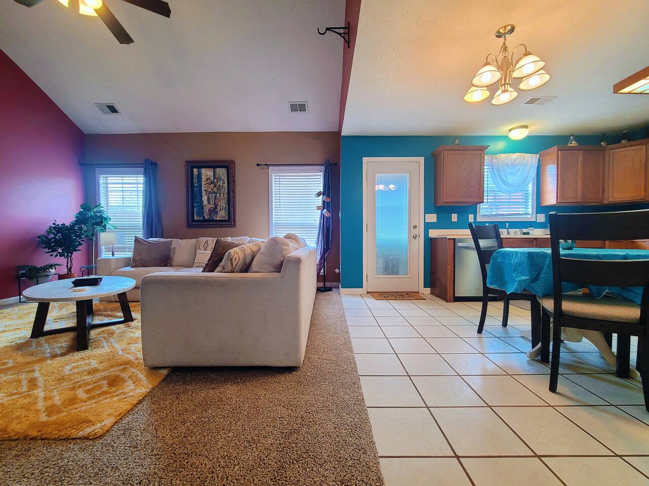 🛋 Living & Common Areas Enjoy a spacious living room with plenty of room to relax, entertain, or gather as a group. The full kitchen is fully equipped with appliances, cookware, and dining essentials—perfect for home-cooked meals. A washer and dryer are conveniently located in-unit for your laundry needs. 🛏 Bedrooms & Layout 4 beds total: 1 King (downstairs), 3 Queens (upstairs) Downstairs: King bedroom with private en-suite + shared half bath Upstairs: 2 private Queen bedrooms with doors 1 open Queen room with walk-in closet, workstation, and sofa bed 1 shared full bathroom upstairs 🌿 Outdoor Space The home features outdoor areas where you can enjoy fresh air, relax with your morning coffee, or unwind in the evenings.
